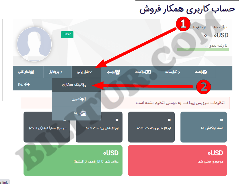 3- پس از ورود به پنل شخصی خود دسترسی دارید که تمام فعالیت ها و درآمد ها قابل نمایش می باشد.از بخش بازاریابی لینک ارجاع خود را دریافت کنید.و در شبکه های اجتماعی انتشار داده و به دوستان خود معرفی کنید.کسانی که با این لینک وارد سایت ما بشوند مشتری شما شناخته شده و در صورت خرید برای شما کمیسیون در نظر گرفته میشود.
